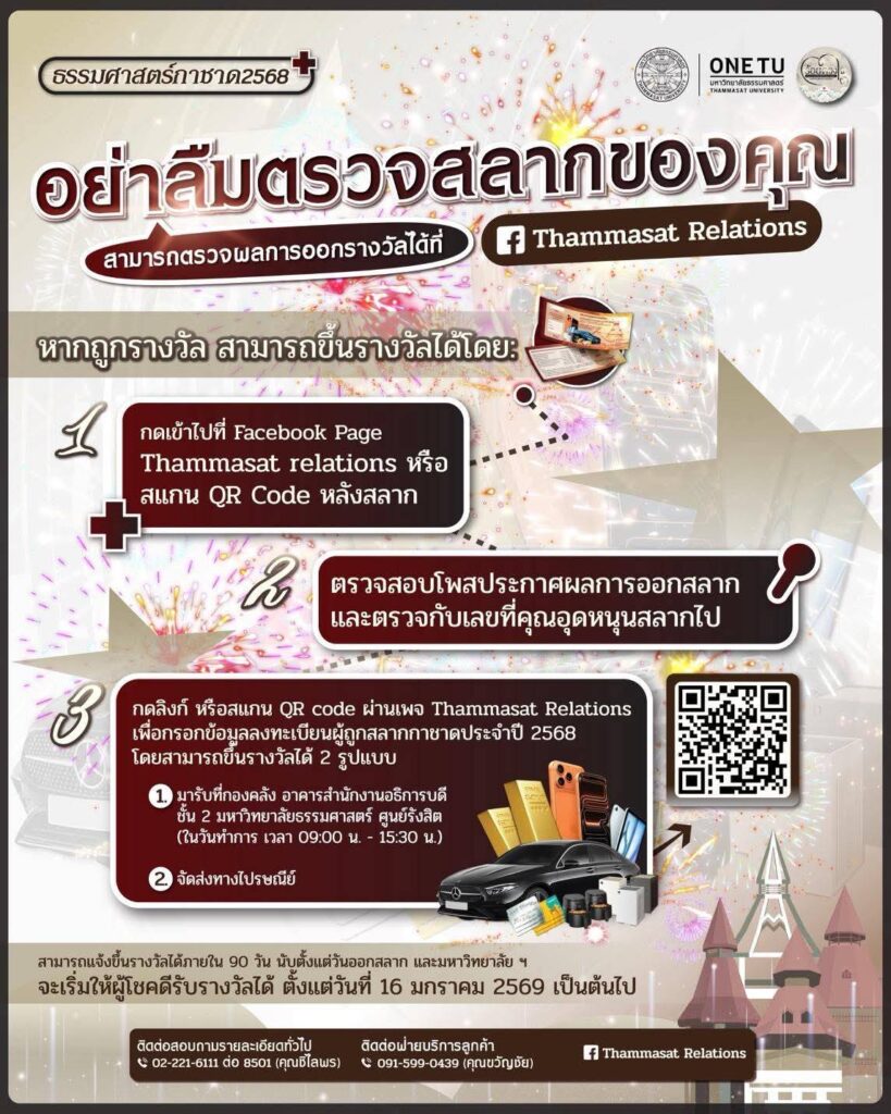 ประกาศผลการออกรางวัลสลากกาชาดมหาวิทยาลัยธรรมศาสตร์ ประจำปี 2568