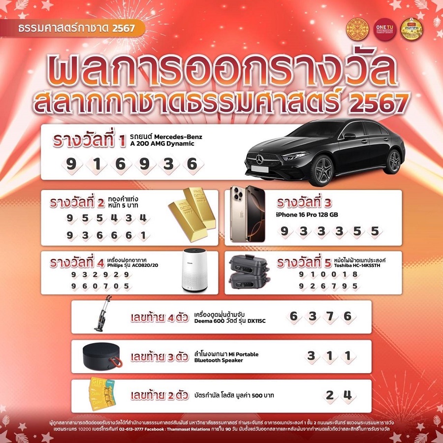 ประกาศผลการออกรางวัลสลากกาชาดมหาวิทยาลัยธรรมศาสตร์ ประจำปี 2567