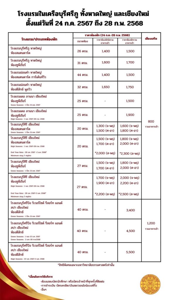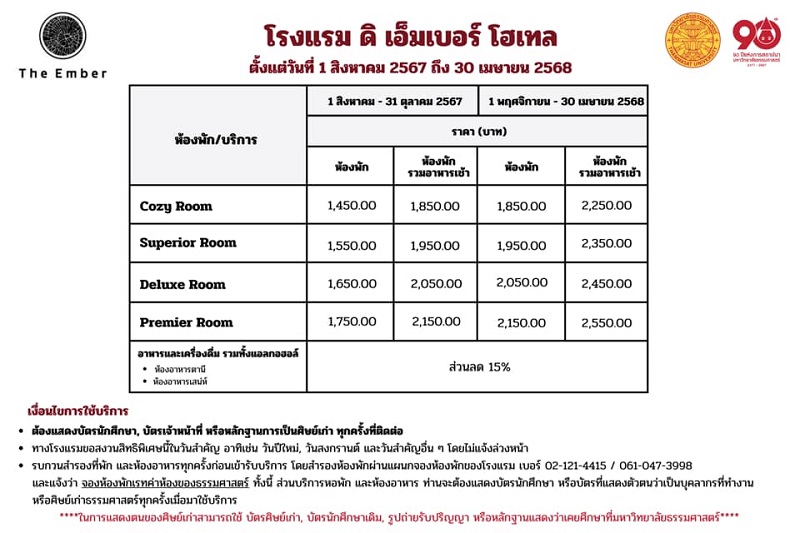 1. แสดงบัตรนักศึกษา หรือบัตรเจ้าหน้าที่ทุกครั้งที่ติดต่อ 2. สำรองห้องพักล่วงหน้า สอบถาม โทร. 087-678-2554