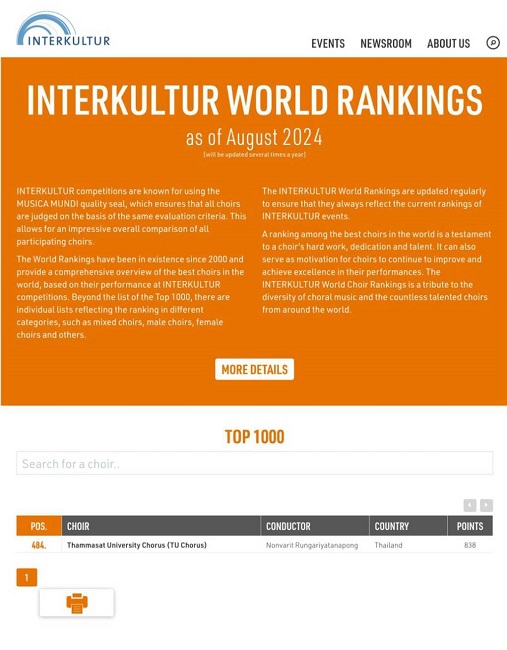 วันที่ 29 สิงหาคม 2567 ที่ผ่านมา มูลนิธิ Interkultur ผู้จัดการกิจกรรมและแข่งขันเกี่ยวกับการขับร้องประสานเสียงที่มีเครือข่ายอยู่ทั่วโลก ได้มีการอัปเดตการจัดอันดับ The INTERKULTUR World Rankings : TOP1000 ซึ่งจะคำนวนอันดับจากคะแนนสะสมจากเวทีการแข่งขันต่าง ๆ ทั่วโลกภายในเครือ Interkultur