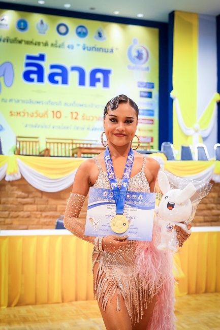 Chachana Iskandar, a first-year student from the Faculty of Liberal Arts, majoring in Psychology at Thammasat University, has been awarded the first prize in the Latin American Class A category of the ballroom dance competition at the 49th National Games “Chan Games” held in Chanthaburi Province.