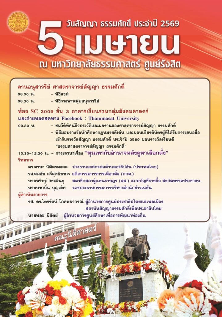 ‘วันสัญญา ธรรมศักดิ์’ ประจำปี 2569 18 มี.ค. 2569 Home » Events » ‘วันสัญญา ธรรมศักดิ์’ ประจำปี 2569 news69-140ดาวน์โหลด แชร์บทความนี้ Share via Facebook Share via X (Twitter) Share via Line Share via mail Copy ข่าวล่าสุด 28 เม.ย. 2569 ธรรมศาสตร์ลำปาง จัดงาน “สืบสานประเพณีปีใหม่เมือง ประจำปี 2569” อ่านต่อ 28 เม.ย. 2569 คณะแพทยศาสตร์ มธ.รับสมัครพนักงานมหาวิทยาลัย สายสนับสนุนวิชาการ ครั้งที่ 3/2569 ตำแหน่ง เภสัชกรปฏิบัติการ จำนวน 2 อัตรา, ถึง 15 พ.ค.69 อ่านต่อ 28 เม.ย. 2569 คณะแพทยศาสตร์ มธ.รับสมัครพนักงานมหาวิทยาลัย สายสนับสนุนวิชาการ ครั้งที่ 4/2569 ตำแหน่ง นักวิชาการศึกษาปฏิบัติการ, ถึง 15 พ.ค.69 อ่านต่อ 28 เม.ย. 2569 คณะแพทยศาสตร์ มธ.รับสมัครพนักงานมหาวิทยาลัย (คณะแพทยศาสตร์) สายสนับสนุนวิชาการ ครั้งที่ 5/2569 ตำแหน่ง นักเทคนิคการแพทย์ปฏิบัติการ, ถึง 15 พ.ค.69 อ่านต่อ