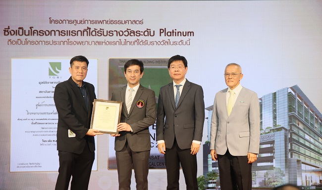 นอกจากนี้ ผศ.ดร.จตุวัฒน์ วโรดมพันธ์ ที่ปรึกษาด้านอาคารเขียวทั้งระบบ LEED AP and TREES ยังได้มอบโล่อาคารเขียวระดับ Platinum ให้กับ ‘ศูนย์การแพทย์ธรรมศาสตร์’ โดยมี รศ.นพ.ดิลก ภิยโยทัย ผู้อำนวยการโรงพยาบาลธรรมศาสตร์ฯ รศ.นพ.พฤหัส ต่ออุดม อดีตผู้อำนวยการโรงพยาบาลธรรมศาสตร์ฯ ซึ่งเป็นผู้สนับสนุนและมีนโยบายให้อาคารศูนย์การแพทย์ฯ เป็นอาคารเขียวระดับ Platinum และ รศ.นพ.จิตตินัดด์ หะวานนท์ ผู้อำนวยการศูนย์การแพทย์ธรรมศาสตร์ ซึ่งเป็นผู้เริ่มโครงการออกแบบอาคารศูนย์การแพทย์ธรรมศาสตร์ เป็นผู้รับมอบฯ นับเป็นโรงพยาบาลแห่งแรกในประเทศไทยที่ผ่านการรับรองอาคารเขียวในระดับ Platinum