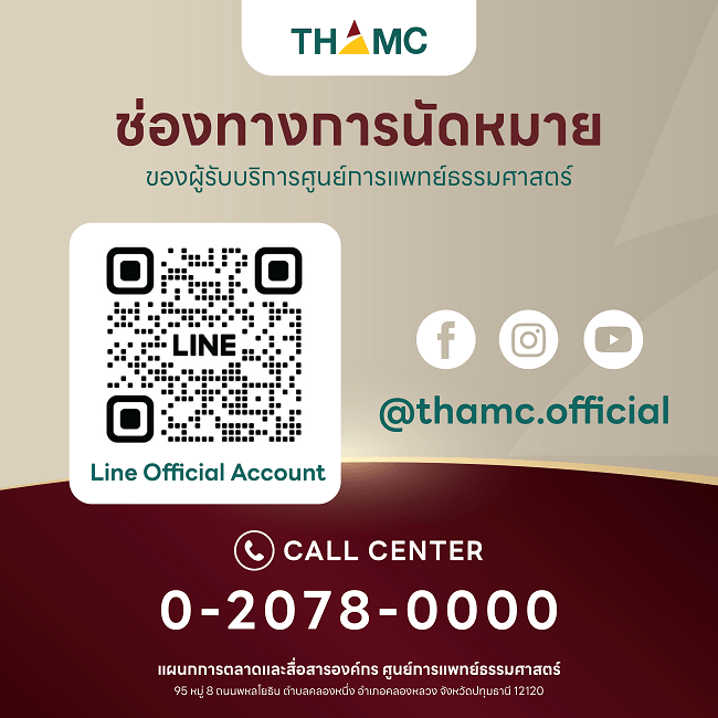 Facebook | Instagram | YouTube | LINE OA: @thamc.official รายละเอียดเพิ่มเติมเกี่ยวกับการให้บริการ ติดต่อได้ที่ โทร. 0-2078-0000 หรือเว็บไซต์ www.tham-c.com