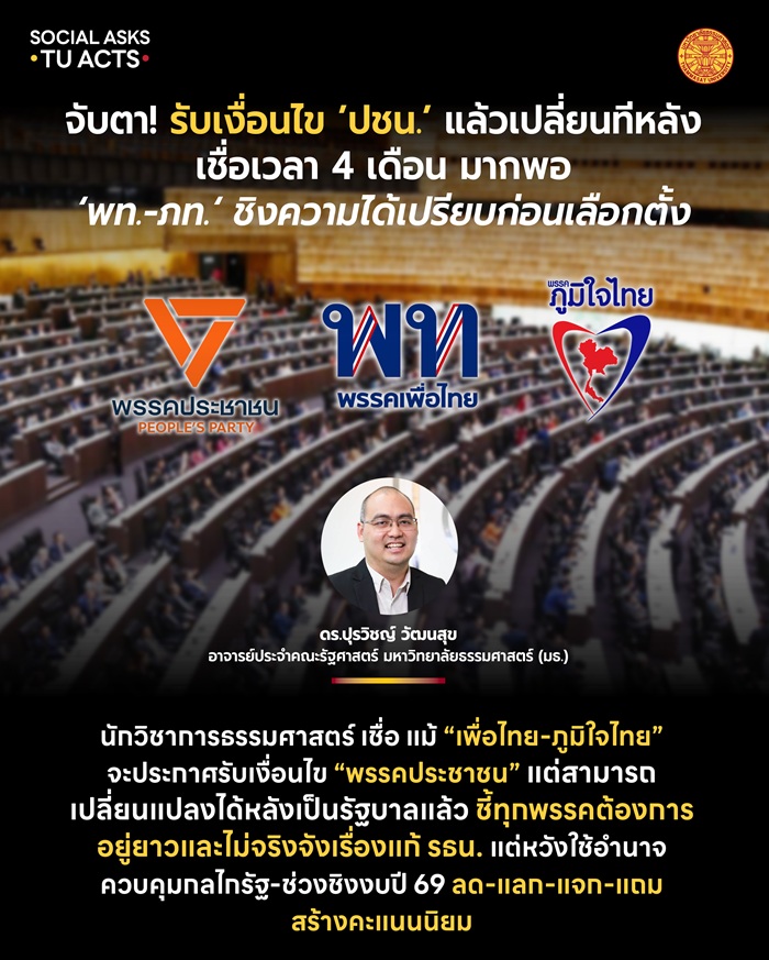 นักวิชาการธรรมศาสตร์ เชื่อแม้เพื่อไทย-ภูมิใจไทย จะประกาศรับเงื่อนไขพรรคประชาชน แต่สามารถเปลี่ยนแปลงได้หลังเป็นรัฐบาลแล้ว