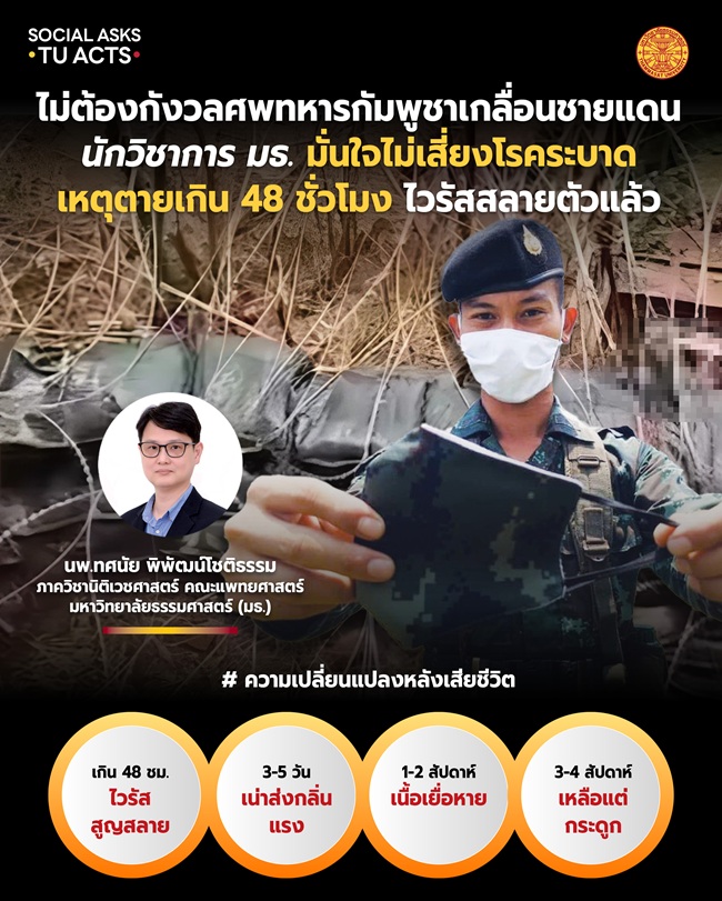 นักวิชาการ มธ. มั่นใจศพทหารกัมพูชาไม่เสี่ยงโรคระบาดเหตุตายเกิน 48 ชั่วโมง ไวรัสสลายตัวแล้ว