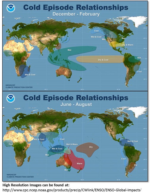 ส่วนเหตุการณ์ตรงกันข้าม คือ ลานีญา เกิดจากลมค้าพัดแรงกว่าปกติ พัดกระแสน้ำอุ่นมาทางฝั่งตะวันตกของมหาสมุทรแปซิฟิกจำนวนมาก ทำให้บริเวณนี้ มีฝนตกหนัก มักเกิดอุทกภัย และทำให้กระแสน้ำเย็นแทรกตัวขึ้นมาบริเวณฝั่งตะวันออกของมหาสมุทร ทำให้แถวประเทศเปรู เอกวาดอร์และโคลัมเบีย เกิดความแห้งแล้งขึ้นได้