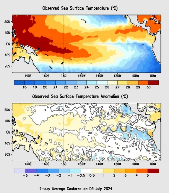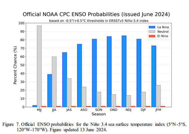 และในช่วงมิถุนายนนี้กำลังเปลี่ยนผ่านจาก เอลนีโญ เข้าสู่สถานะเป็นกลางในเดือนกรกฎาคม ถึง สิงหาคม และเดือนสิงหาคม เริ่ม ลานีญา อาจยาวถึงช่วงเดือนมีนาคม พ.ศ. 2568 โดยความเป็นไปได้สูงสุด 85% ที่จะเกิด ลานีญา ในช่วงเดือนพฤศจิกายน ถึง มกราคม และสังเกตุจากข้อมูลได้ว่า หลังเกิด เอลนีโญ แรง ๆ จะเกิด ลานีญา ตามมาเสมอ โดยทุกท่านสามารถเข้าเว็บ CPC (Climate prediction center) เพื่อติดตามสถานการณ์ของปรากฎการณ์ ENSO ได้เอง