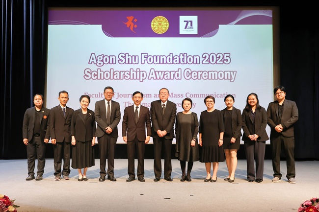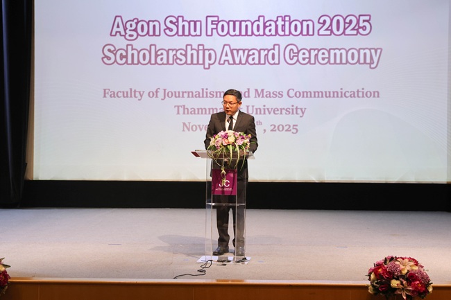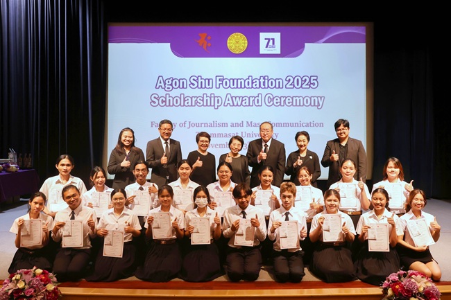 เมื่อวันที่ 13 พฤศจิกายน 68 มหาวิทยาลัยธรรมศาสตร์ นำโดยกองกิจการนักศึกษา และคณะวารสารศาสตร์และสื่อสารมวลชน จัดพิธีรับมอบทุนการศึกษาของมูลนิธิ Agon Shu Foundation ประจำปีการศึกษา 2568 ได้รับเกียรติจาก Ms. Kazuko Maki, Director of the Agon Shu International Department ผู้แทนจากมูลนิธิ เป็นผู้มอบทุนฯ แก่นักศึกษา โดยมี รศ. ดร.กิตติวัฒน์ จันทร์แจ่มใส รองอธิการบดีฝ่ายบริหารศูนย์ลำปางและการนักศึกษา เป็นประธานในพิธี พร้อมด้วย ศ. ดร.สมคิด เลิศไพฑูรย์ อดีตอธิการบดีฯ ผศ. ดร.อัจฉรา ปัณฑรานุวงศ์ คณบดีคณะวารสารศาสตร์และสื่อสารมวลชน คณาจารย์ และเจ้าหน้าที่ ร่วมเป็นสักขีพยาน ณ ห้อง JC Cinema คณะวารสารศาสตร์และสื่อสารมวลชน มหาวิทยาลัยธรรมศาสตร์ ศูนย์รังสิต
