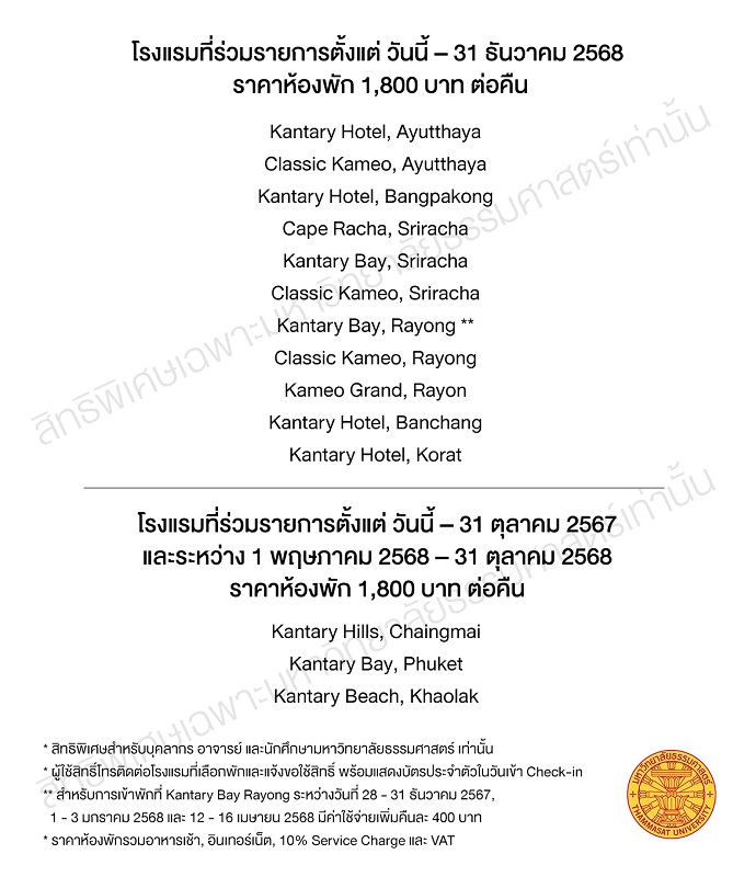 โรงแรมในเครือ Kantary มอบราคาพิเศษคืนละ 1,800 บาท รวมอาหารเช้า ให้บุคลากรและนักศึกษาธรรมศาสตร์ ดึงโรงแรมในเครือ 14 แห่งทั่วประเทศในจุดท่องเที่ยวสุดพีคร่วมดีล
