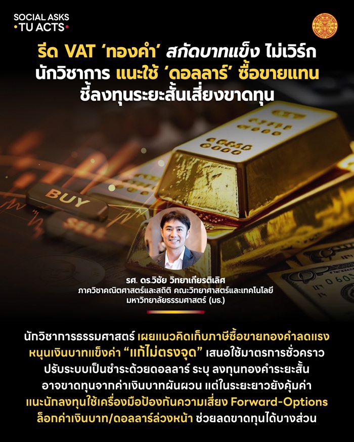“การเก็บภาษีธุรกรรมทองคำที่ชำระด้วยเงินบาท แม้จะช่วยลดแรงซื้อเงินบาทได้บางส่วน แต่ผู้เล่นสามารถเปลี่ยนไปใช้การชำระด้วยดอลลาร์แทนได้ทันที จึงเปรียบเสมือนการแก้สมการผิดตัวแปร ทำให้ได้รับผลลัพธ์ไม่ตรงจุดและอาจสร้างผลข้างเคียงเพิ่มความผันผวน กลายเป็นการสร้างภาระต่อตลาดและผู้ลงทุนทองคำในประเทศได้” รศ. ดร.วิชัย กล่าว