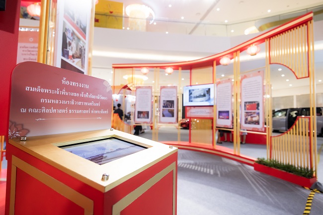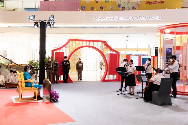 ในการนี้ ศ.ดร.สุรพล นิติไกรพจน์ นายกสภามหาวิทยาลัยธรรมศาสตร์ รศ.เกศินี วิฑูรชาติ อธิการบดีมหาวิทยาลัยธรรมศาสตร์ คุณดารณี วัธนเวคิน นายกสมาคมศิลปศาสตร์ธรรมศาสตร์ฯ ในฐานะประธานคณะกรรมการจัดงาน คุณหญิงวงจันทร์ พินัยนิติศาสตร์ นายกสภาสถาบันดนตรีกัลยาณิวัฒนา คุณธนากร เสรีบุรี ผู้แทนจากเครือเจริญโภคภัณฑ์ และผู้บริหารศูนย์การค้าไอคอนสยาม เข้าเฝ้ารับเสด็จจากนั้นทอดพระเนตรการแสดงจากนักศึกษาจากคณะศิลปศาสตร์ มหาวิทยาลัยธรรมศาสตร์ และนักศึกษาจากสถาบันดนตรีกัลยาณิวัฒนา และทอดพระเนตรนิทรรศการ “แก้วกัลยา เส้นทางสายสัมพันธ์ไทย-จีน” ซึ่งมีเนื้อหาประกอบไปด้วย ส่วนของการแสดงพระประวัติของสมเด็จพระเจ้าพี่นางเธอ เจ้าฟ้ากัลยาณิวัฒนา กรมหลวงนราธิวาสราชนครินทร์ พระกรณียกิจด้านการเสริมสร้างสัมพันธไมตรีระหว่างไทย-จีน ความร่วมมือไทย-จีนด้านคณิตศาสตร์และวิทยาศาสตร์ศึกษา และสายใยความสัมพันธ์ทางวัฒนธรรมระหว่างไทย-จีนในด้านต่าง ๆ