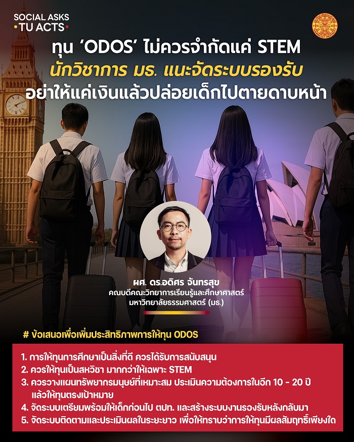 นักวิชาการธรรมศาสตร์ ชี้โครงการให้ทุน ODOS ไม่ควรจำกัดให้เรียนต่อเฉพาะแค่ STEM แนะจัดทำระบบเตรียมความพร้อมก่อนไป ตปท. – กลับมามีระบบงานรอบรับ พร้อมติดตามประเมินผล