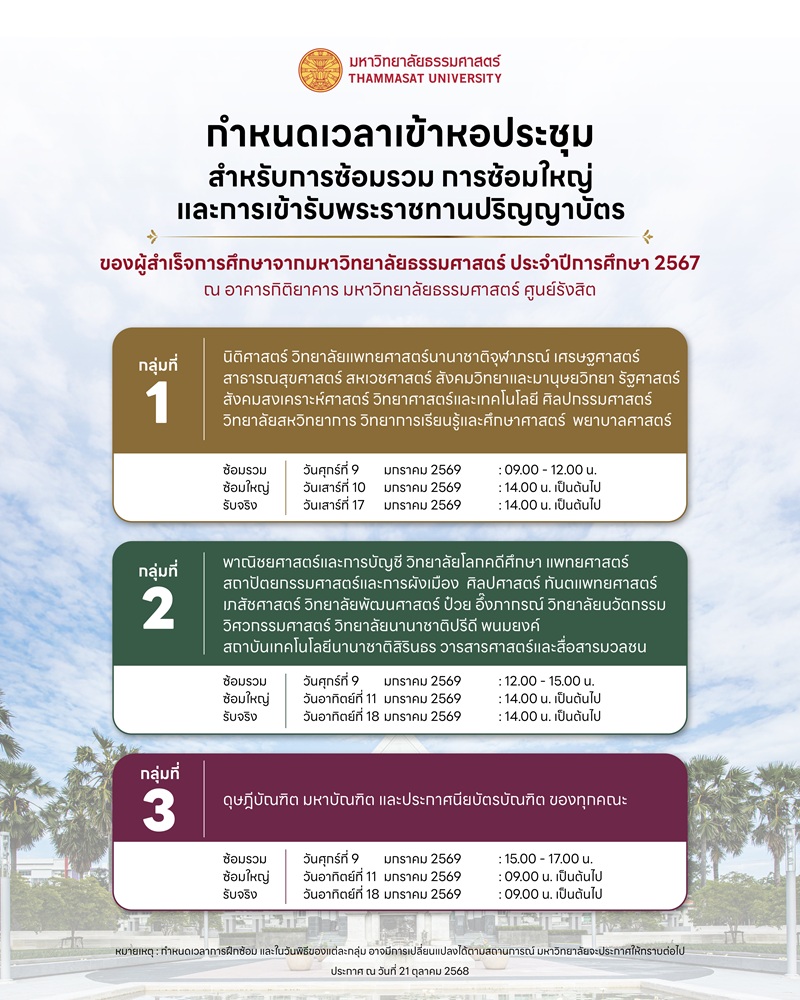 🔹 ประกาศมหาวิทยาลัยธรรมศาสตร์ เรื่อง กำหนดการฝึกซ้อมและการรับพระราชทานปริญญาบัตร ประจำปีการศึกษา 2567