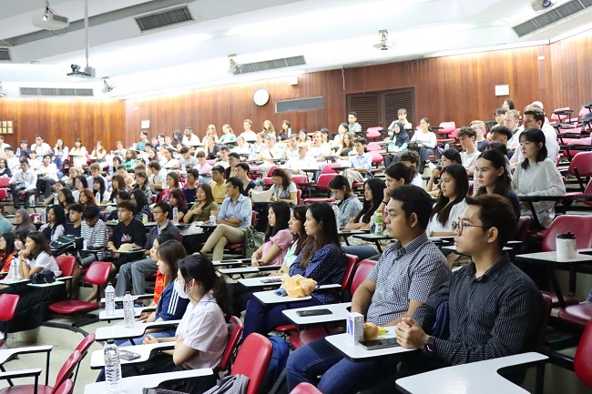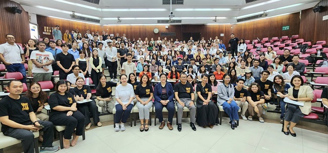 2 August 2024: Almost 200 international students from various countries attended the Thammasat International Day for semester 1/2024 at the Law Faculty lecture hall on the Tha Prachan Campus. The morning session began with an opening speech from the Vice Rector for International Affairs, Assoc. Prof. Dr. Supreedee Rittironk, to encourage students to embrace their new environment during their time at Thammasat. The Vice Rector also gave special talks on “Guidance for new TU friends: Do’s and Don’t’s in Thailand” and “All you should know about Thailand” to acquaint students with life in Thailand and acquire a feel for what the Thai culture and etiquette are like.