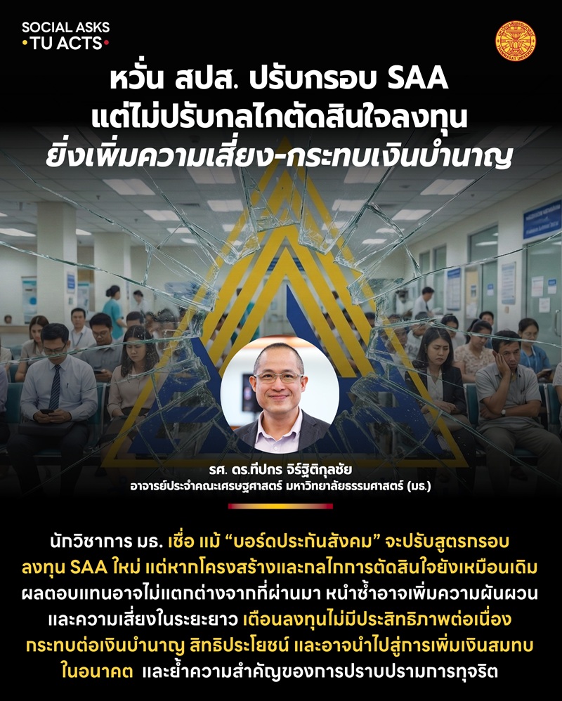 นักวิชาการธรรมศาสตร์ เชื่อ แม้ “บอร์ดประกันสังคม” จะปรับสูตรกรอบลงทุน SAA ใหม่เป็น 50:50 ระหว่างสินทรัพย์เสี่ยงสูงและเสี่ยงต่ำ แต่หากโครงสร้างและกลไกการตัดสินใจยังเหมือนเดิม ผลตอบแทนอาจไม่แตกต่างจากที่ผ่านมา หนำซ้ำอาจเพิ่มความผันผวนและความเสี่ยงในระยะยาว เตือนหากปล่อยให้การลงทุนไม่มีประสิทธิภาพต่อเนื่อง จะกระทบต่อเงินบำนาญ สิทธิประโยชน์ และอาจนำไปสู่การเพิ่มเงินสมทบในอนาคต พร้อมเสนอเร่งสร้างความยั่งยืนกองทุน และย้ำความสำคัญของการปราบปรามการทุจริต