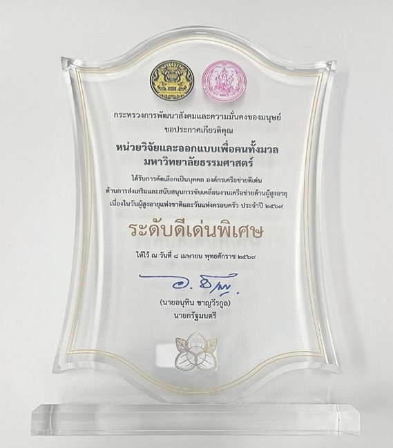 หน่วยวิจัยและออกแบบเพื่อคนทั้งมวล คณะสถาปัตยกรรมศาสตร์และการผังเมือง มธ. ได้รับการคัดเลือกเป็นบุคคล องค์กรเครือข่ายดีเด่น ด้านการส่งเสริมและสนับสนุนการขับเคลื่อนงานเครือข่ายด้านผู้สูงอายุ “ระดับดีเด่นพิเศษ” เนื่องในวันผู้สูงอายุแห่งชาติและวันแห่งครอบครัว ประจำปี 2569