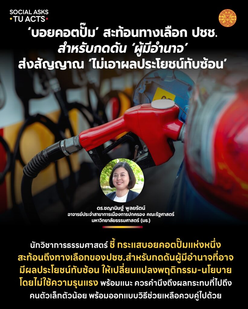 นักวิชาการธรรมศาสตร์ชี้ กระแสบอยคอตปั๊มแห่งหนึ่ง สะท้อนถึงทางเลือกของ ปชช. สำหรับกดดันผู้มีอำนาจที่อาจมีผลประโยชน์ทับซ้อน ให้เปลี่ยนแปลงพฤติกรรม-นโยบาย โดยไม่ใช้ความรุนแรง พร้อมแนะ ควรคำนึงถึงผลกระทบที่ไปถึงคนตัวเล็กตัวน้อย พร้อมออกแบบวิธีช่วยเหลือควบคู่ไปด้วย