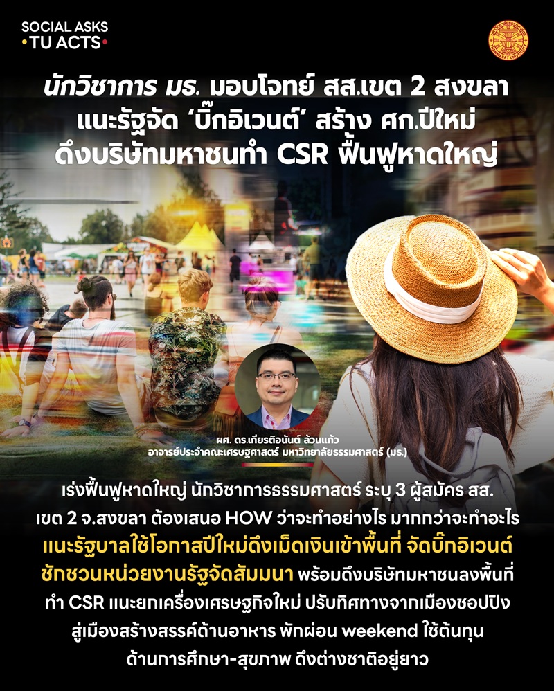 นักวิชาการ มธ. มอบโจทย์ สส.เขต 2 สงขลา แนะรัฐจัด ‘บิ๊กอิเวนต์’ สร้าง ศก.ปีใหม่ ดึงบริษัทมหาชนทำ CSR ฟื้นฟูหาดใหญ่