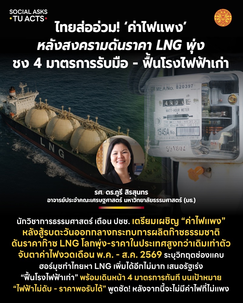 นักวิชาการธรรมศาสตร์ เตือน ปชช. เตรียมเผชิญ “ค่าไฟแพง” หลังสู้รบตะวันออกกลางกระทบการผลิตก๊าซธรรมชาติ ดันราคาก๊าซ LNG โลกพุ่ง-ราคาในประเทศสูงกว่าเดิมเท่าตัว จับตาค่าไฟงวดเดือน พ.ค. – ส.ค. 2569 ระบุวิกฤตช่องแคบฮอร์มุซทำไทยหา LNG เพิ่มได้อีกไม่มาก เสนอรัฐเร่ง “ฟื้นโรงไฟฟ้าเก่า” พร้อมเดินหน้า 4 มาตรการทันที บนเป้าหมาย “ไฟฟ้าไม่ดับ – ราคาพอรับได้” พูดชัด! หลังจากนี้จะไม่มีค่าไฟที่ไม่แพง