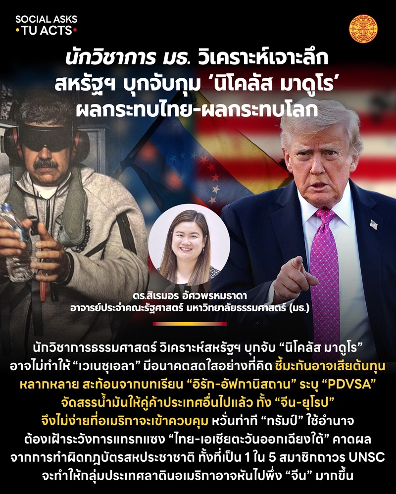 ดร.สิเรมอร อัศวพรหมธาดา อาจารย์ประจำคณะรัฐศาสตร์ มหาวิทยาลัยธรรมศาสตร์ (มธ.) กล่าวถึงกรณีที่ โดนัลด์ ทรัมป์ ประธานาธิบดีสหรัฐอเมริกา ไฟเขียวให้กองกำลังทหารสหรัฐฯ เปิดปฏิบัติการบุกจับกุม นิโคลัส มาดูโร ประธานาธิบดีเวเนซุเอลา เมื่อวันที่ 3 ม.ค. 2569 ตอนหนึ่งว่า หากมองปรากฎการณ์ครั้งนี้สะท้อนว่าสหรัฐฯ ได้ใช้อำนาจของตนเองในการบุกรุก ปราบปราม และเข้าแทรกแซงประเทศอื่นอย่างเข้มข้น โดยไม่รับฟังเสียงทัดทานจากนานาชาติที่มีเพิ่มมากขึ้น ตรงนี้เป็นสิ่งที่ประเทศไทยและประเทศอื่นๆ ในภูมิภาคเอเชียตะวันออกเฉียงใต้ควรจับตาและเฝ้าระมัดระวัง เพราะถึงแม้ว่าจะไม่เกิดเหตุรุนแรงเช่นเดียวกับเวเนซุเอลา แต่การแทรกแซงอาจมาในรูปแบบอื่นๆ เช่น การเป็นตัวกลางในการเจรจาเรื่องไทย-กัมพูชา หรือการจัดการปัญหาสแกมเมอร์ข้ามชาติ ฯลฯ