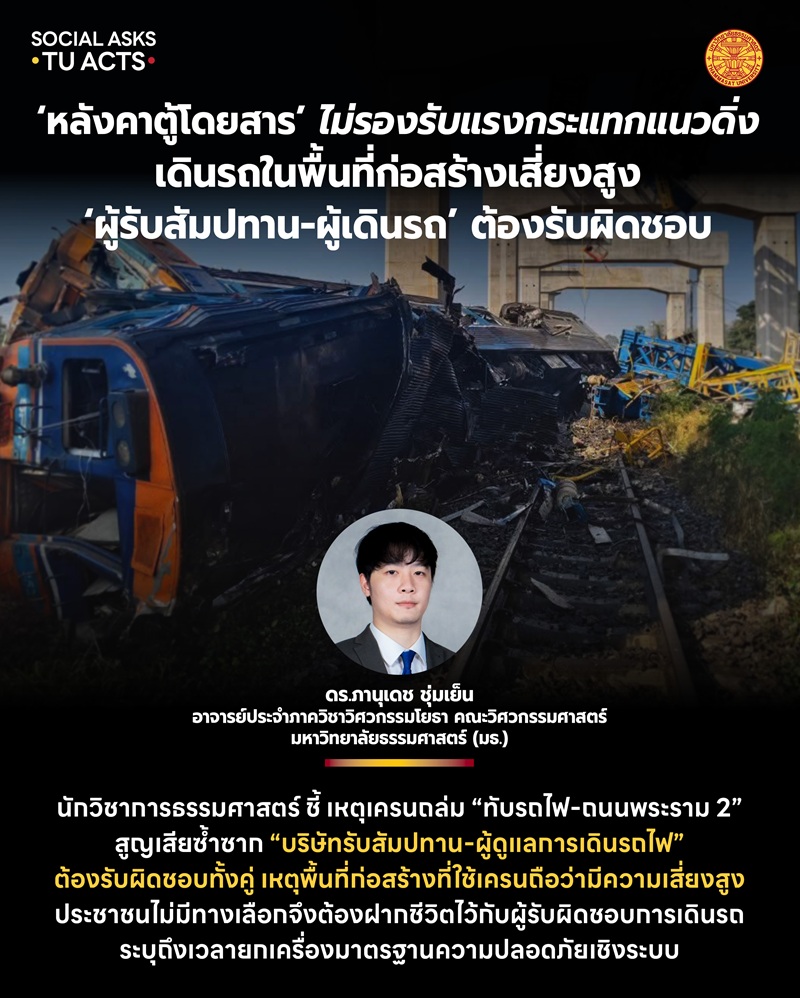 นักวิชาการธรรมศาสตร์ ชี้ เหตุเครนถล่ม “ทับรถไฟ-ถนนพระราม 2” สูญเสียซ้ำซาก “บริษัทรับสัมปทาน-ผู้ดูแลการเดินรถไฟ” ต้องรับผิดชอบทั้งคู่ เหตุพื้นที่ก่อสร้างที่ใช้เครนถือว่ามีความเสี่ยงสูง ประชาชนไม่มีทางเลือกจึงต้องฝากชีวิตไว้กับผู้รับผิดชอบการเดินรถ ระบุถึงเวลายกเครื่องมาตรฐานความปลอดภัยเชิงระบบ โดยเฉพาะการก่อสร้างซ้อนทับพื้นที่สาธารณะและเกี่ยวข้องหลายฝ่าย ต้องมีผู้มีอำนาจสั่งการหน้างาน พร้อมตั้ง “คนนอก” เป็นคณะผู้ตรวจสอบความปลอดภัยโครงการแทนคนที่ผู้รับสัมปทานหามาเอง และเพิ่มความถี่การตรวจสอบ